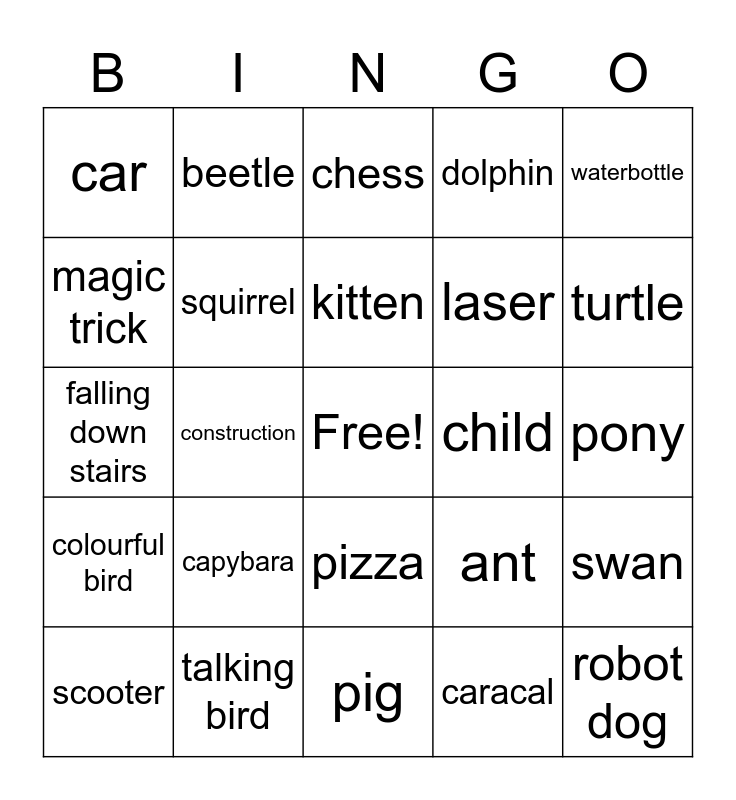 This bingo card has a free space and 111 words: hedgehog, dog, cat, body of water, underwater, lake, ocean/sea, video game, movie, robot, plane, boat, alligator/croc, seal, chemistry, onion, pizza, fire, explosion, bicycle, scooter, chess, boardgame, painting, music, colourful bird, talking bird, animal acting human, cute, elderly person, car, construction, bubbles, china, usa, canada, dog swimming, cat swimming, brown bear, black bear, polar bear, dog+bear, airplane, puppy, kitten, baby animal, pig, cow, calf, piglet, skiing, snowboarding, beaver, tornado, rat, motercycle, magic trick, gorrila, monkey, animation, duck, chicken, goose, timelapse, car crash, laser, mars, the moon, space, squirrel, turtle, tortoise, lizard, snake, backflip, frontflip, giraffe, emu, ostrich, capybara, skydiving, caracal, child, swan, goat, whale, dolphin, meerkat, robot dog, shibe inu, waterbottle, bottle flip, avalanche, drone, moose, limmo, falling down stairs, spider, black cat, white cat, orange cat, bubbles, shark, LEGO, ant, beetle, bug, peacock, horse, pony and weird animal noise.