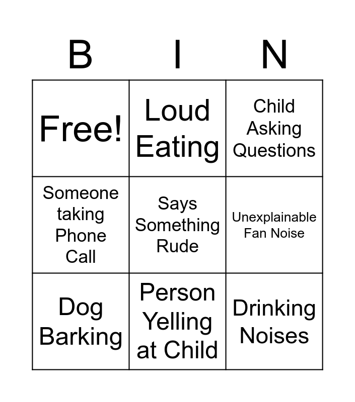 This bingo card has 9 words: Dog Barking, Child Asking Questions, Loud Eating, Someone taking Phone Call, Free!, Unexplainable Fan Noise, Says Something Rude, Drinking Noises and Person Yelling at Child.