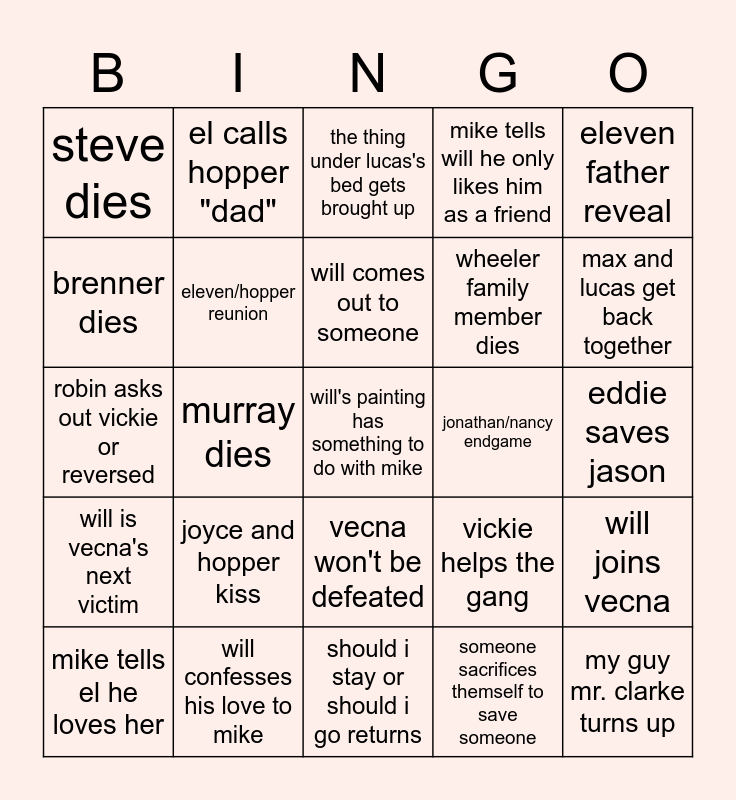 This bingo card has a free space and 24 words: joyce and hopper kiss, will confesses his love to mike, will comes out to someone, mike tells el he loves her, eleven father reveal, steve dies, brenner dies, el calls hopper "dad", jonathan/nancy endgame, vecna won't be defeated, wheeler family member dies, robin asks out vickie or reversed, vickie helps the gang, will joins vecna, eleven/hopper reunion, someone sacrifices themself to save someone, eddie saves jason, the thing under lucas's bed gets brought up, max and lucas get back together, murray dies, my guy mr. clarke turns up, will is vecna's next victim, mike tells will he only likes him as a friend and should i stay or should i go returns.