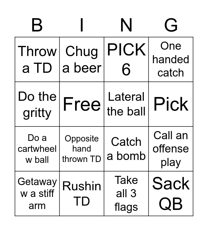 This bingo card has 16 words: Rushin TD, Call an offense play, PICK 6, Throw a TD, Do a cartwheel w ball, Chug a beer, Catch a bomb, Take all 3 flags, Do the gritty, Free, Getaway w a stiff arm, One handed catch, Opposite hand thrown TD, Pick, Lateral the ball and Sack QB.