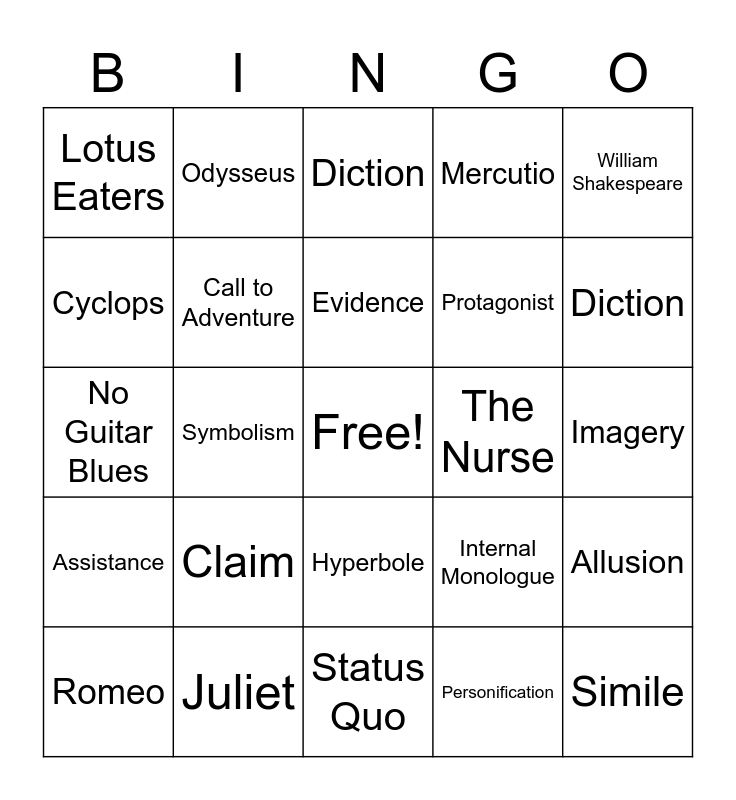 This bingo card has a free space and 42 words: Theme, Evidence, Warrant, Claim, Personification, Allusion, Simile, Metaphor, Diction, Hyperbole, Imagery, Diction, Symbolism, William Shakespeare, Dialogue, Internal Monologue, Parker Outside the Box, No Guitar Blues, Homer, Odysseus, Cyclops, Resolution, Climax, Lotus Eaters, Rising Action, Exposition, Protagonist, Treasure, Crisis, Trials, Departure, Assistance, Call to Adventure, Status Quo, The Friar, Romeo, Juliet, The Nurse, Lady Capulet, Benvolio, Mercutio and Tybalt.