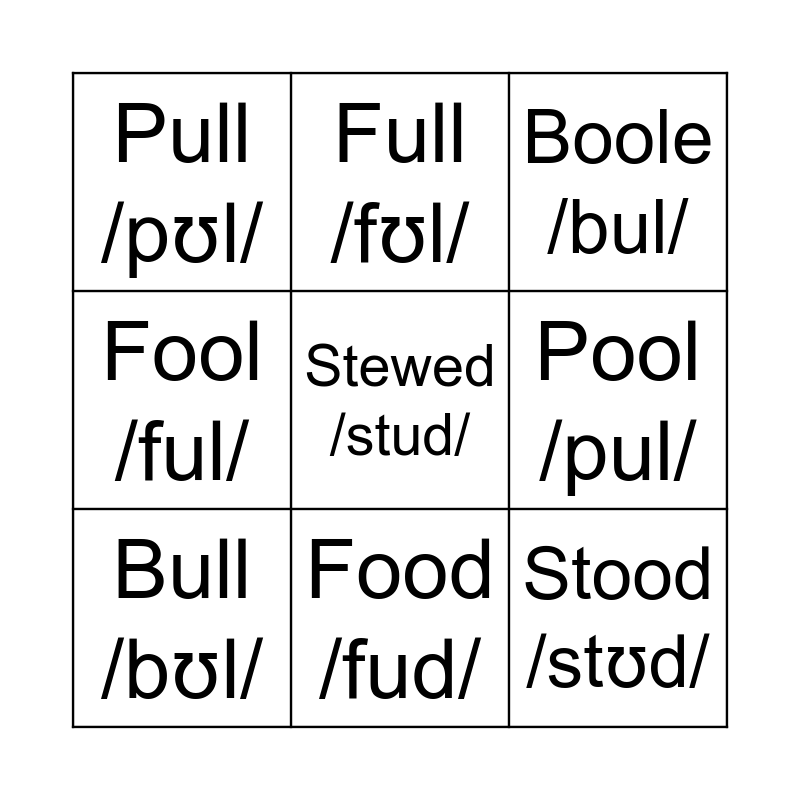 This bingo card has 9 words: Bull /bʊl/, Boole /bul/, Full /fʊl/, Fool /ful/, Pull /pʊl/, Pool /pul/, Stewed /stud/, Stood /stʊd/ and Food /fud/.