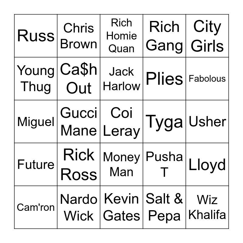 This bingo card has 26 words: Money Man, Salt & Pepa, Jack Harlow, Nardo Wick, City Girls, Russ, Young Thug, Chris Brown, Usher, Pusha T, Plies, Miguel, Lloyd, Cam'ron, Gucci Mane, Fetty Wap, Rich Gang, Future, Rich Homie Quan, Coi Leray, Fabolous, Kevin Gates, Tyga, Rick Ross, Ca$h Out and Wiz Khalifa.