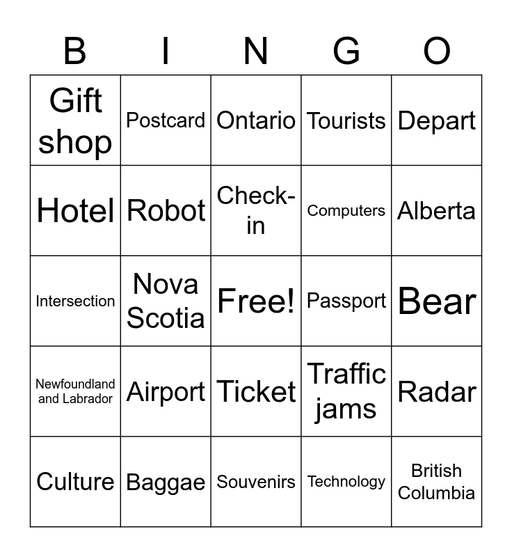 This bingo card has a free space and 24 words: Airport, Baggae, Check-in, Culture, Depart, Gift shop, Hotel, Postcard, Passport, Ticket, Computers, Intersection, Traffic jams, Radar, Robot, Technology, Bear, Ontario, Alberta, Nova Scotia, British Columbia, Newfoundland and Labrador, Tourists and Souvenirs.