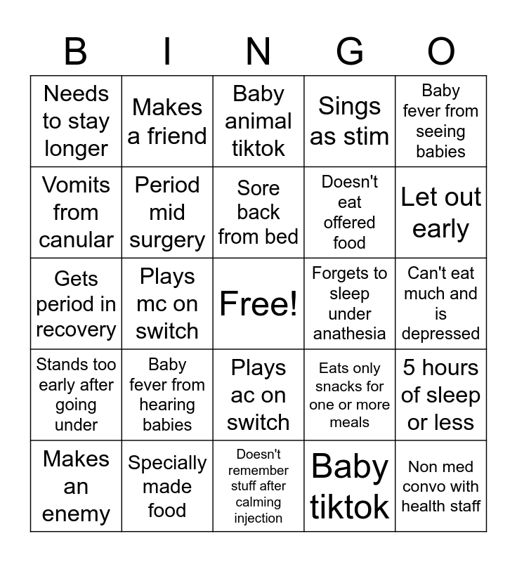 This bingo card has a free space and 24 words: Baby fever from hearing babies, Specially made food, Sore back from bed, Makes an enemy, Baby fever from seeing babies, Needs to stay longer, Vomits from canular, Makes a friend, Forgets to sleep under anathesia, Plays ac on switch, Doesn't eat offered food, Gets period in recovery, Eats only snacks for one or more meals, 5 hours of sleep or less, Period mid surgery, Baby tiktok, Can't eat much and is depressed, Baby animal tiktok, Let out early, Plays mc on switch, Non med convo with health staff, Stands too early after going under, Sings as stim and Doesn't remember stuff after calming injection.