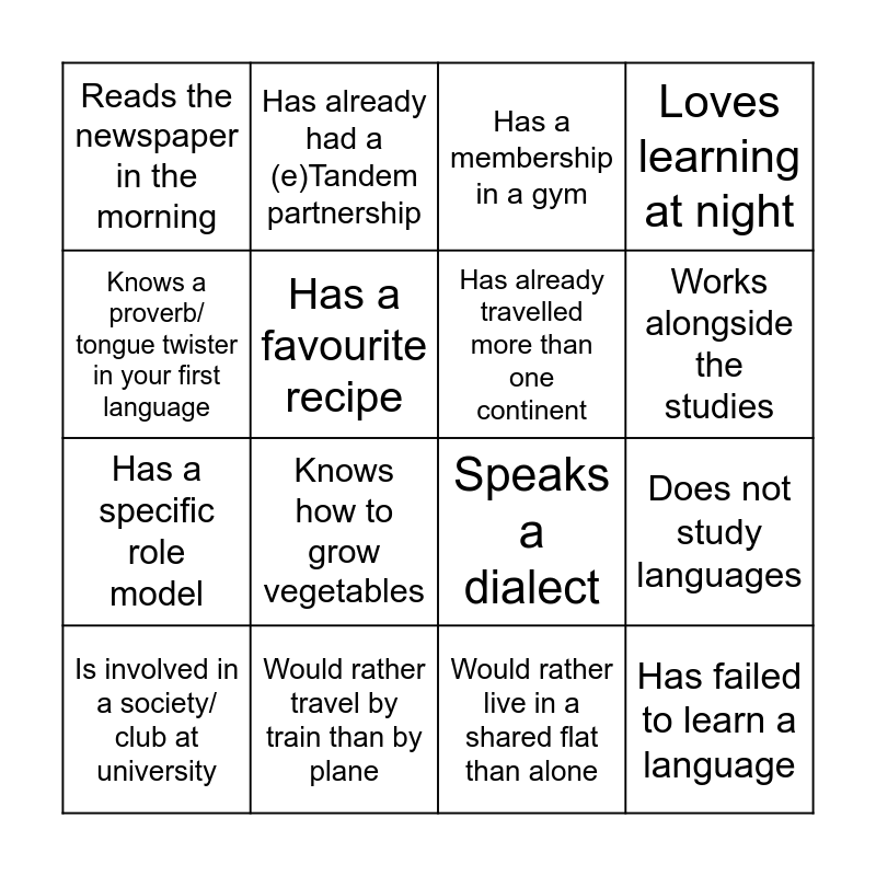 This bingo card has 16 words: Would rather travel by train than by plane, Does not study languages, Has a membership in a gym, Reads the newspaper in the morning, Has a specific role model, Has already had a (e)Tandem partnership, Speaks a dialect, Would rather live in a shared flat than alone, Knows a proverb/ tongue twister in your first language, Has a favourite recipe, Is involved in a society/ club at university, Loves learning at night, Knows how to grow vegetables, Works alongside the studies, Has already travelled more than one continent and Has failed to learn a language.