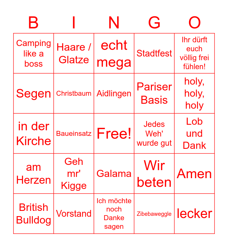 This bingo card has a free space and 27 words: Wir beten, Gemeinschaft, Pariser Basis, Ich möchte noch Danke sagen, Segen, echt mega, Haare / Glatze, am Herzen, Jedes Weh' wurde gut, Amen, in der Kirche, Stadtfest, British Bulldog, Vorstand, holy, holy, holy, Krippenspiel, Christbaum, Aidlingen, Geh mr' Kigge, Camping like a boss, Lob und Dank, Zibebaweggle, Baueinsatz, lecker, Galama, Ihr dürft euch völlig frei fühlen! and Wer will, darf auch aufstehen..