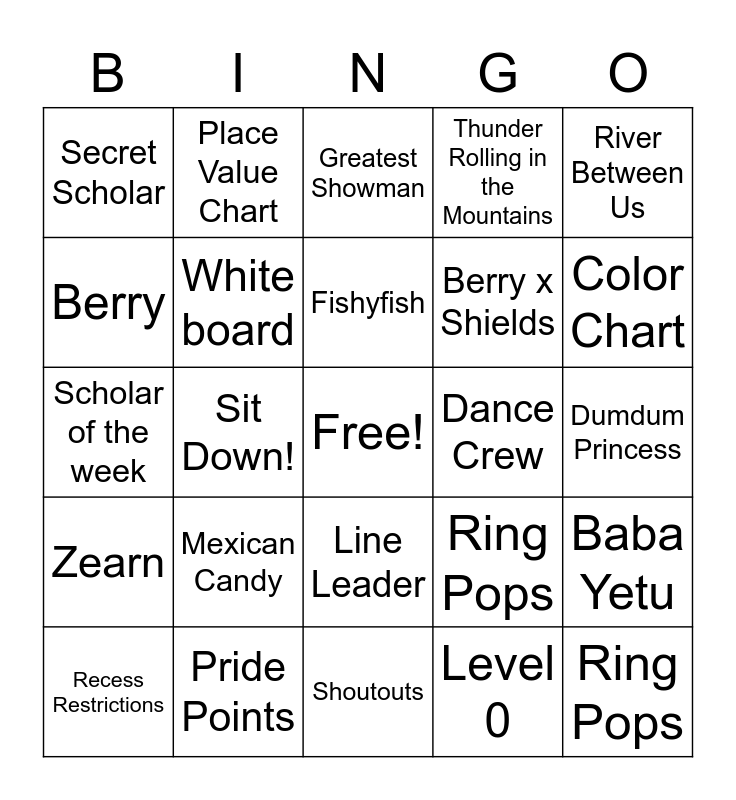 This bingo card has a free space and 24 words: Mexican Candy, Pride Points, Fishyfish, Recess Restrictions, River Between Us, Secret Scholar, Berry, Place Value Chart, Dance Crew, Line Leader, Berry x Shields, Scholar of the week, Ring Pops, Baba Yetu, White board, Level 0, Dumdum Princess, Greatest Showman, Color Chart, Sit Down!, Ring Pops, Zearn, Thunder Rolling in the Mountains and Shoutouts.