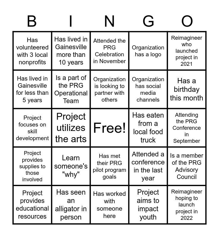 This bingo card has a free space and 24 words: Learn someone's "why", Has seen an alligator in person, Organization is looking to partner with others, Project provides educational resources, Reimagineer who launched project in 2021, Has volunteered with 3 local nonprofits, Has lived in Gainesville for less than 5 years, Has lived in Gainesville more than 10 years, Has eaten from a local food truck, Has met their PRG pilot program goals, Organization has social media channels, Project focuses on skill development, Attended a conference in the last year, Is a member of the PRG Advisory Council, Is a part of the PRG Operational Team, Project aims to impact youth, Attending the PRG Conference in September, Attended the PRG Celebration in November, Has a birthday this month, Project utilizes the arts, Reimagineer hoping to launch project in 2022, Project provides supplies to those involved, Organization has a logo and Has worked with someone here.