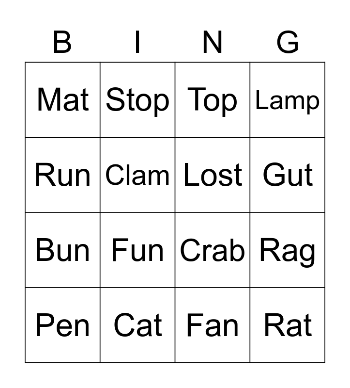 This bingo card has 20 words: Rag, Cup, Top, Pet, Pen, Run, Cat, Mat, Bun, Stop, Fun, Crab, Clam, Rat, Lost, Pal, Gut, Lamp, Fan and Plot.