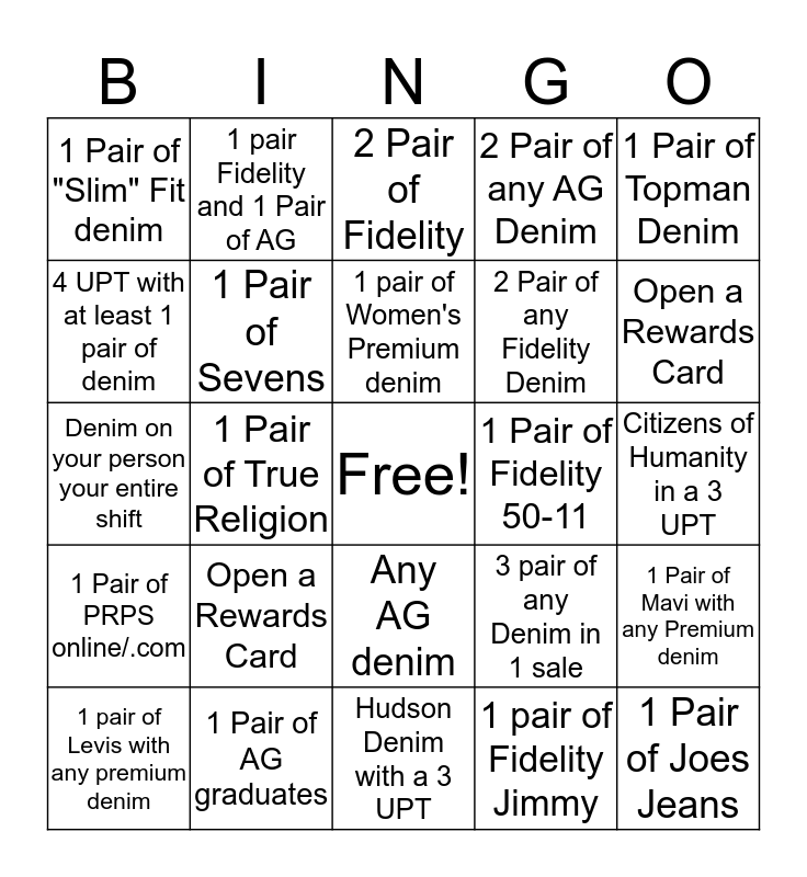 This bingo card has a free space and 24 words: Open a Rewards Card, 1 Pair of AG graduates, 1 pair of Women's Premium denim, 1 pair of Levis with any premium denim, 1 Pair of Topman Denim, 1 Pair of "Slim" Fit denim, 4 UPT with at least 1 pair of denim, 1 pair Fidelity and 1 Pair of AG, 1 Pair of Fidelity 50-11, Any AG denim, 2 Pair of any Fidelity Denim, Denim on your person your entire shift, 3 pair of any Denim in 1 sale, 1 Pair of Mavi with any Premium denim, 1 Pair of Sevens, 1 pair of Fidelity Jimmy, Citizens of Humanity in a 3 UPT, 2 Pair of Fidelity, Open a Rewards Card, 1 Pair of True Religion, 1 Pair of Joes Jeans, 1 Pair of PRPS online/.com, 2 Pair of any AG Denim and Hudson Denim with a 3 UPT.