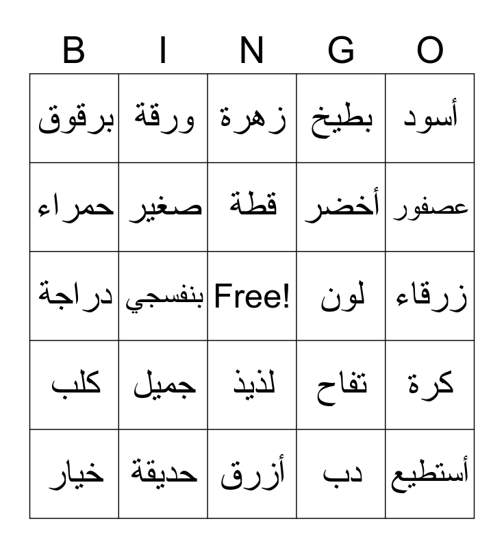 This bingo card has a free space and 24 words: جميل, حديقة, قطة, خيار, أسود, برقوق, حمراء, ورقة, لون, لذيذ, أخضر, دراجة, تفاح, كرة, صغير, دب, زرقاء, زهرة, عصفور, بنفسجي, أستطيع, كلب, بطيخ and أزرق.
