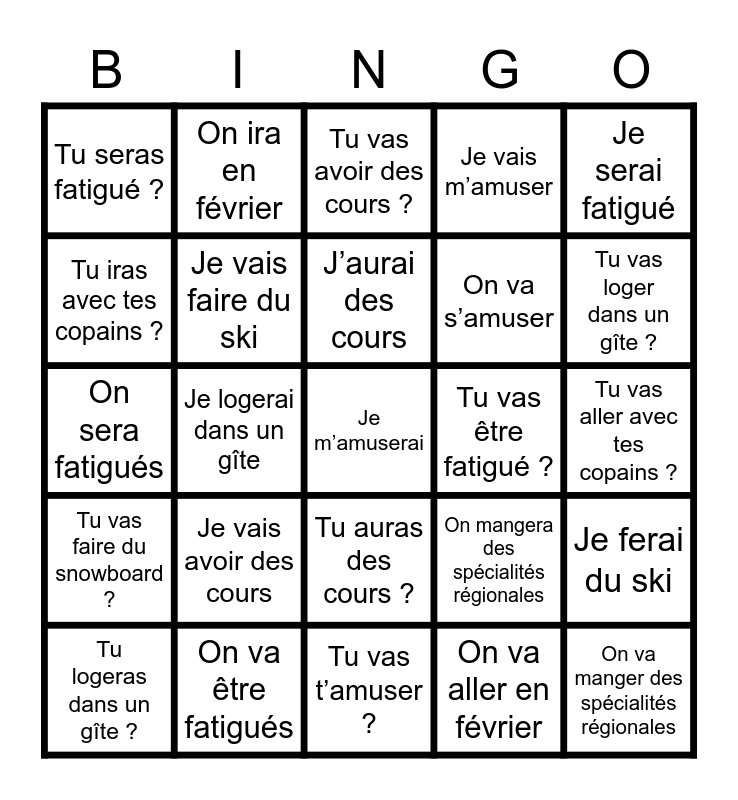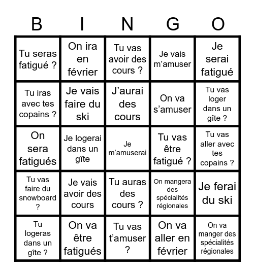 This bingo card has 37 words: Free!, Je vais aller en France, J’irai en France, Je vais faire du ski, Je ferai du ski, Je vais avoir des cours, J’aurai des cours, Je vais être fatigué, Je serai fatigué, Je vais loger dans un gîte, Je logerai dans un gîte, Je vais m’amuser, Je m’amuserai, Tu vas aller avec tes copains ?, Tu iras avec tes copains ?, Tu vas faire du snowboard ?, Tu feras du snowboard, Tu vas avoir des cours ?, Tu auras des cours ?, Tu vas être fatigué ?, Tu seras fatigué ?, Tu vas loger dans un gîte ?, Tu logeras dans un gîte ?, Tu vas t’amuser ?, Tu t’amuseras ?, On va aller en février, On ira en février, On va faire la fête, On fera la fête, On va avoir un gâteau, On aura un gâteau, On va être fatigués, On sera fatigués, On va manger des spécialités régionales, On mangera des spécialités régionales, On va s’amuser and On s’amusera.