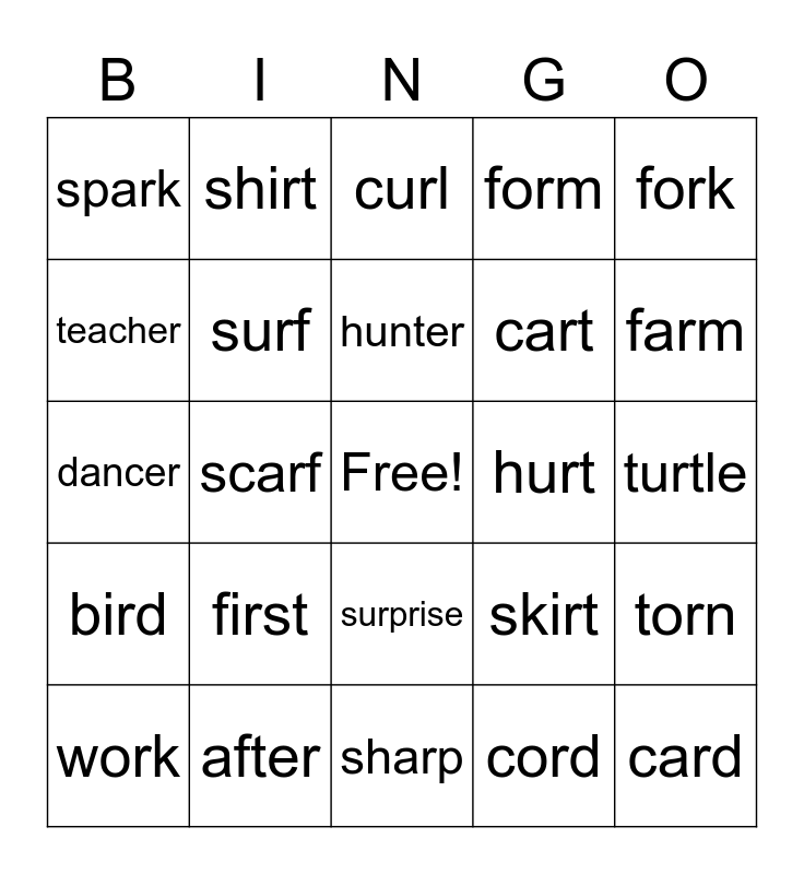This bingo card has a free space and 25 words: first, sharp, hunter, work, fork, spark, teacher, shirt, hurt, surprise, cart, dancer, skirt, torn, surf, slirp, turtle, curl, farm, scarf, card, after, bird, form and cord.