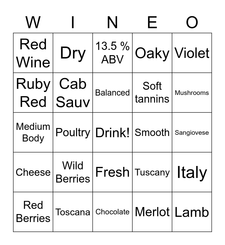This bingo card has a free space and 24 words: Wild Berries, Toscana, Balanced, Red Berries, Violet, Red Wine, Ruby Red, Dry, Smooth, Fresh, Soft tannins, Medium Body, Tuscany, Italy, Cab Sauv, Merlot, Sangiovese, 13.5 % ABV, Mushrooms, Poultry, Lamb, Cheese, Oaky and Chocolate.
