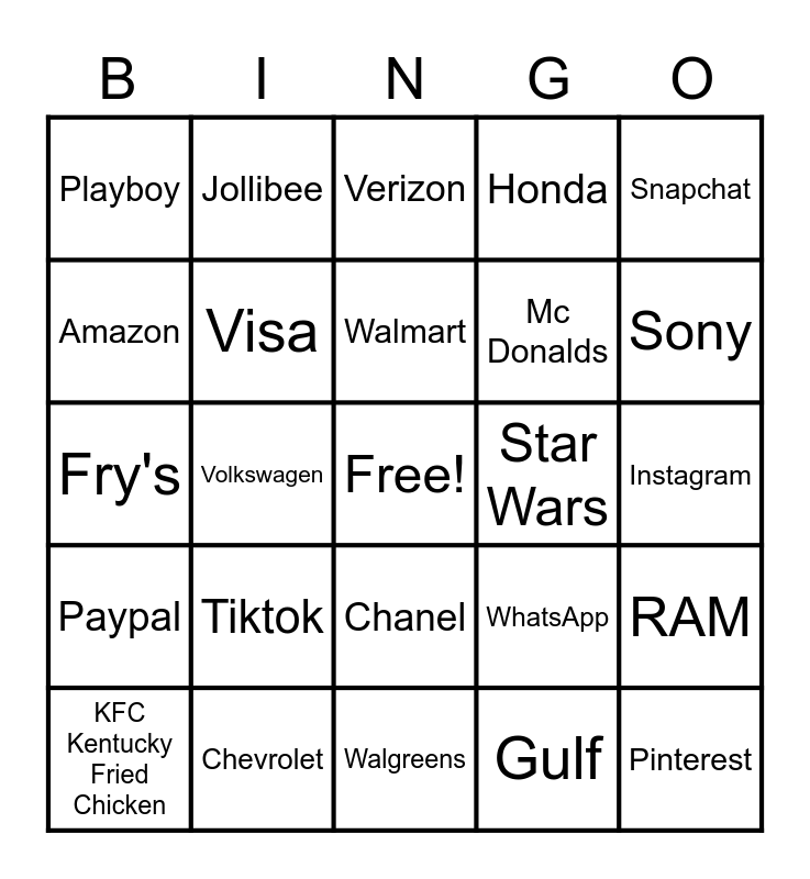 This bingo card has a free space and 65 words: Rolex, Twitter, Safeway, RAM, Apple, HSBC, Jollibee, Google, Walmart, Microsoft, Chanel, Mastercard, Instagram, Snapchat, Mercedes Benz, Amazon, Volkswagen, Playboy, Pepsi, Mc Donalds, Tiktok, Paypal, Honda, Netflix, Facebook, Alibaba, Starbucks, Spotify, Pinterest, Subway, KFC Kentucky Fried Chicken, Mitsubishi, Youtube, Toyota, WhatsApp, Chevrolet, Albertsons, Fry's, Gulf, Crest, Visa, Dunkin Donuts, Star Wars, Pixar, Lucas Films, Kodak, Sony, Funko, Atari, Nintendo, Quicktrip, Pfizer, CVS, Walgreens, Home Depot, Lowes, Kroger, Verizon, Comcast, Dell, Target, Bank Of America, Panasonic, Minolta and Fuji.