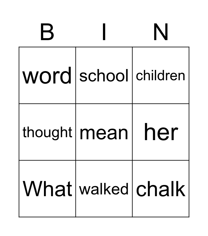 This bingo card has 1 images, a free space and 11 words: yawned, walked, chalk, What, school, children, her, house, thought, word and talk.
