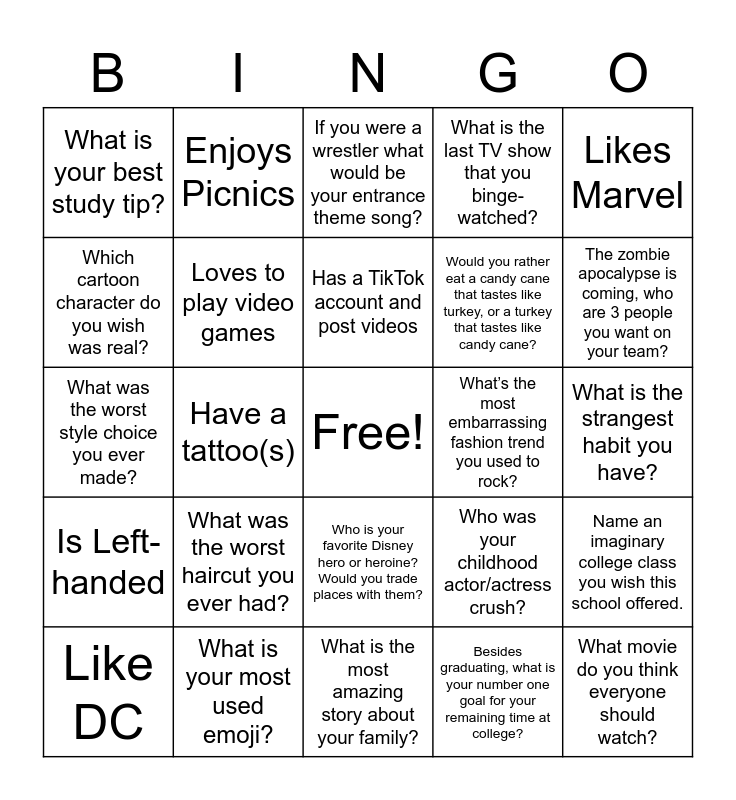 This bingo card has a free space and 33 words: Have more than 5 siblings, Traveled to a different state or country: Name the country/State, Have a tattoo(s), Have the same birthday month as you, Is Left-handed, Loves to play video games, Likes Marvel, Like DC, Enjoys Picnics, Knows how to ride a bike, Has a TikTok account and post videos, If you were a wrestler what would be your entrance theme song?, Have you ever been told you look like someone famous, who was it?, If you could bring back any fashion trend what would it be?, What’s the most embarrassing fashion trend you used to rock?, The zombie apocalypse is coming, who are 3 people you want on your team?, What is your most used emoji?, What was the worst style choice you ever made?, What was the worst haircut you ever had?, Who was your childhood actor/actress crush?, Who is your favorite Disney hero or heroine? Would you trade places with them?, What is your favorite midnight snack?, What is your best study tip?, What is the strangest habit you have?, What is the most amazing story about your family?, What movie do you think everyone should watch?, What is the last TV show that you binge-watched?, Would you rather eat a candy cane that tastes like turkey, or a turkey that tastes like candy cane?, Which cartoon character do you wish was real?, Name an imaginary college class you wish this school offered., What current fact about your life would most impress your five year old self?, Besides graduating, what is your number one goal for your remaining time at college? and Describe the best teacher you have had so far..