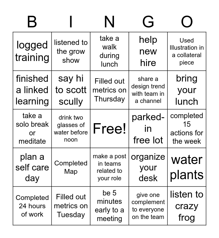 This bingo card has a free space and 24 words: Completed Map, Filled out metrics on Tuesday, Filled out metrics on Thursday, Completed 24 hours of work, Used Illustration in a collateral piece, logged training, finished a linked learning, listened to the grow show, parked-in free lot, make a post in teams related to your role, share a design trend with team in a channel, take a solo break or meditate, organize your desk, water plants, say hi to scott scully, give one complement to everyone on the team, completed 15 actions for the week, take a walk during lunch, bring your lunch, drink two glasses of water before noon, listen to crazy frog, plan a self care day, help new hire and be 5 minutes early to a meeting.