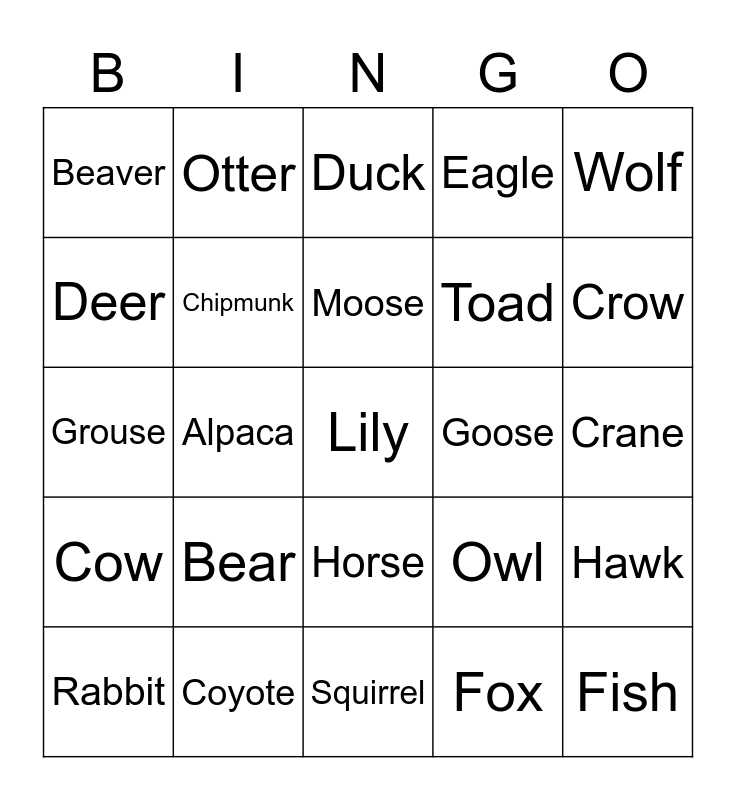 This bingo card has a free space and 24 words: Rabbit, Bear, Moose, Fox, Wolf, Beaver, Otter, Duck, Goose, Crane, Grouse, Chipmunk, Owl, Hawk, Deer, Coyote, Squirrel, Eagle, Crow, Cow, Alpaca, Horse, Toad and Fish.