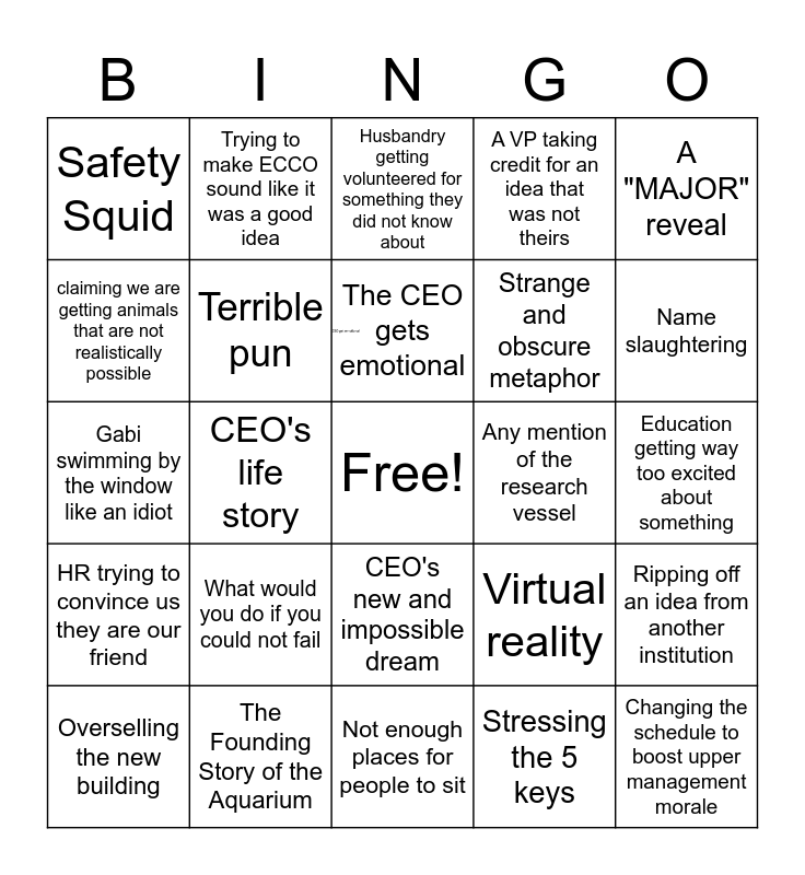 This bingo card has 1 images, a free space and 24 words: What would you do if you could not fail, The Founding Story of the Aquarium, The CEO gets emotional, Overselling the new building, A "MAJOR" reveal, Safety Squid, claiming we are getting animals that are not realistically possible, Trying to make ECCO sound like it was a good idea, Any mention of the research vessel, CEO's new and impossible dream, Strange and obscure metaphor, Gabi swimming by the window like an idiot, Virtual reality, Ripping off an idea from another institution, Terrible pun, Stressing the 5 keys, Education getting way too excited about something, Husbandry getting volunteered for something they did not know about, Name slaughtering, CEO's life story, Changing the schedule to boost upper management morale, HR trying to convince us they are our friend, A VP taking credit for an idea that was not theirs and Not enough places for people to sit.