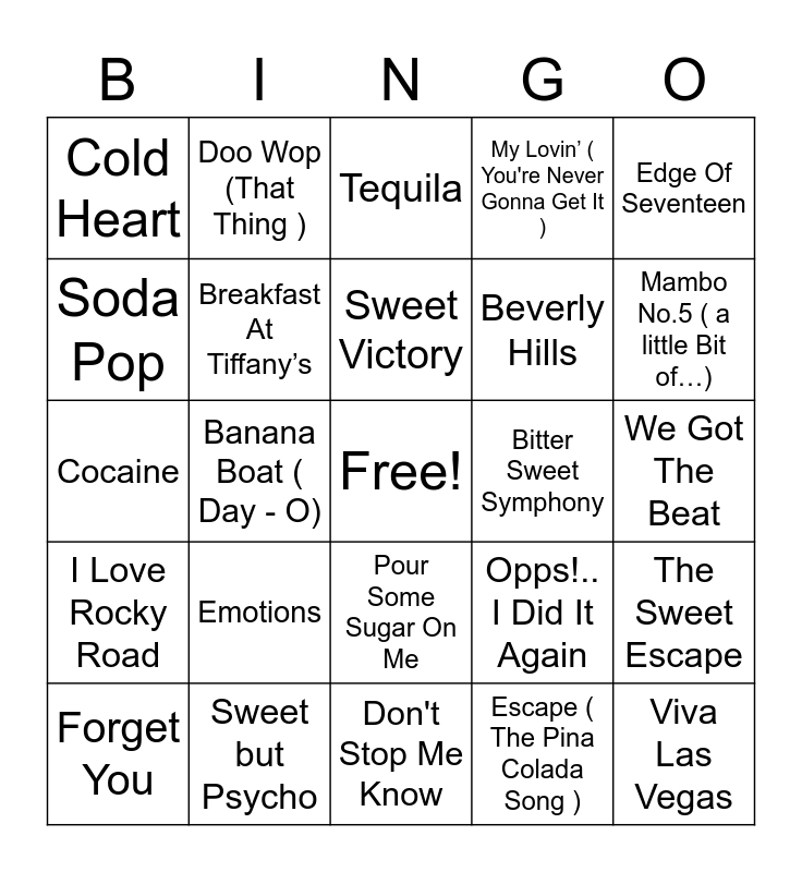 This bingo card has a free space and 71 words: Get Up Offa That Thing, Doo Wop (That Thing ), What Makes You Beautiful, Tearin’ Up My Heart, Don't Stop Me Know, Sucker, My Lovin’ ( You're Never Gonna Get It ), Counting Stars, Beverly Hills, Bye Bye Bye, Forget You, Get The Party Started, Mambo No.5 ( a little Bit of…), Cold Heart, Bad Habits, Cocaine, Opps!.. I Did It Again, Edge Of Seventeen, Kiss, We Got The Beat, Emotions, Viva Las Vegas, The Sweet Escape, Sweet Caroline, Sweet Child O’ Mine, Sugar, Sugar, Candyman, Sugar - Maroon 5, I Want Candy, Build Me Up Buttercup, Sweet but Psycho, Watermelon Sugar, Cake By The Ocean, Yummy, Escape ( The Pina Colada Song ), Milkshake, American Pie, Cherry PIe, Soda Pop, Honey, Im Good, Pour Some Sugar On Me, Buttered Popcorn, I Love Rocky Road, Brown Sugar, Blueberry Hill, Lollipop, Tutti Frutti, Breakfast At Tiffany’s, CheeseBurger In Paradise, Shake The Sugar Tree, Savoy Truffle, Butterscotch, Bitter Sweet Symphony, Sweet Dreams ( Are Made Of This ) - Eumathermics, Sweet Home Alabama, Peaches, Sweet Victory, Sweet Emotion, Sweet Dreams - Beyonce, Chicken Fried, Sugar - Stevie Wonder, Biscuits, Banana Boat ( Day - O), Tootsee Roll, Sweetest Pie, Mother Popcorn, Tequila, Jessie’s Girl, Take It Easy, Red Red Wine and Elderberry Wine.