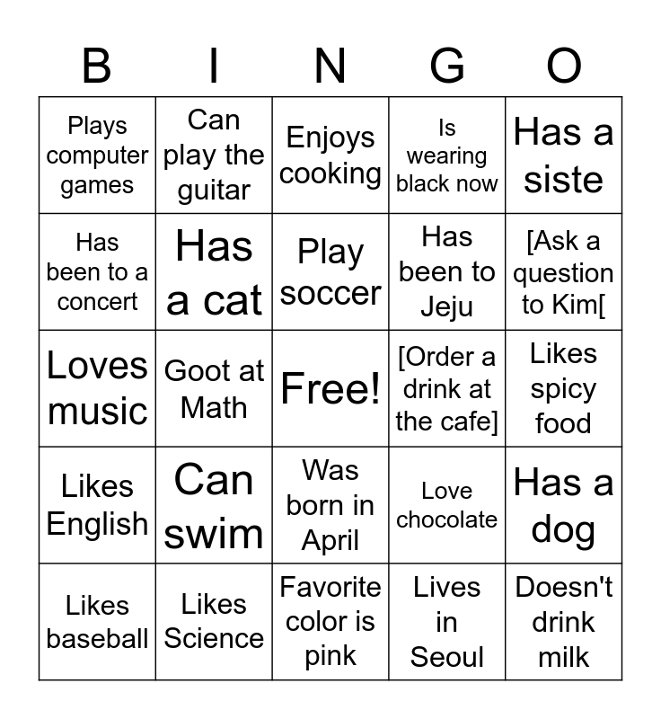 This bingo card has a free space and 24 words: Can swim, Likes Science, Play soccer, Likes baseball, Has a siste, Plays computer games, Has been to a concert, Can play the guitar, [Order a drink at the cafe], Was born in April, Has been to Jeju, Loves music, Love chocolate, Has a dog, Has a cat, Lives in Seoul, Likes spicy food, Enjoys cooking, [Ask a question to Kim[, Goot at Math, Doesn't drink milk, Likes English, Is wearing black now and Favorite color is pink.