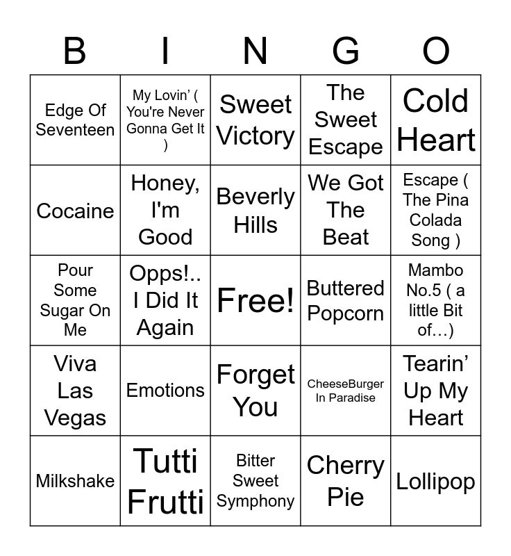 This bingo card has a free space and 64 words: Get Up Offa That Thing, Doo Wop (That Thing ), What Makes You Beautiful, Tearin’ Up My Heart, Don't Stop Me Know, Sucker, My Lovin’ ( You're Never Gonna Get It ), Counting Stars, Beverly Hills, Bye Bye Bye, Forget You, Get The Party Started, Mambo No.5 ( a little Bit of…), Cold Heart, Bad Habits, Cocaine, Opps!.. I Did It Again, Edge Of Seventeen, Kiss, We Got The Beat, Emotions, Viva Las Vegas, The Sweet Escape, Sweet Caroline, Sweet Child O’ Mine, Sugar, Sugar, Candyman, Sugar - Maroon 5, I Want Candy, Build Me Up Buttercup, Sweet but Psycho, Watermelon Sugar, Cake By The Ocean, Yummy, Escape ( The Pina Colada Song ), Milkshake, American Pie, Cherry Pie, Soda Pop, Honey, I'm Good, Pour Some Sugar On Me, Buttered Popcorn, I Love Rocky Road, Brown Sugar, Blueberry Hill, Lollipop, Tutti Frutti, Breakfast At Tiffany’s, CheeseBurger In Paradise, Shake The Sugar Tree, Savoy Truffle, Butterscotch, Bitter Sweet Symphony, Sweet Dreams ( Are Made Of This ) - Eumathermics, Sweet Home Alabama, Peaches, Sweet Victory, Sweet Emotion, Tequila, Jessie’s Girl, Raise Your Glass, Take It Easy, Red Red Wine and Elderberry Wine.