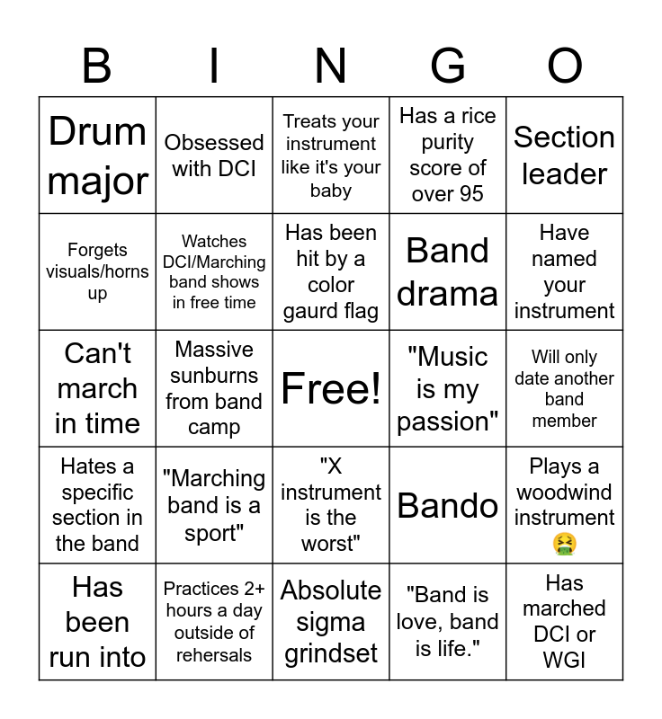 This bingo card has a free space and 24 words: "Marching band is a sport", Practices 2+ hours a day outside of rehersals, Has been hit by a color gaurd flag, Has been run into, Section leader, Drum major, Forgets visuals/horns up, Obsessed with DCI, "Music is my passion", "X instrument is the worst", Band drama, Can't march in time, Bando, Plays a woodwind instrument 🤮, Watches DCI/Marching band shows in free time, "Band is love, band is life.", Will only date another band member, Treats your instrument like it's your baby, Have named your instrument, Massive sunburns from band camp, Has marched DCI or WGI, Hates a specific section in the band, Has a rice purity score of over 95 and Absolute sigma grindset.