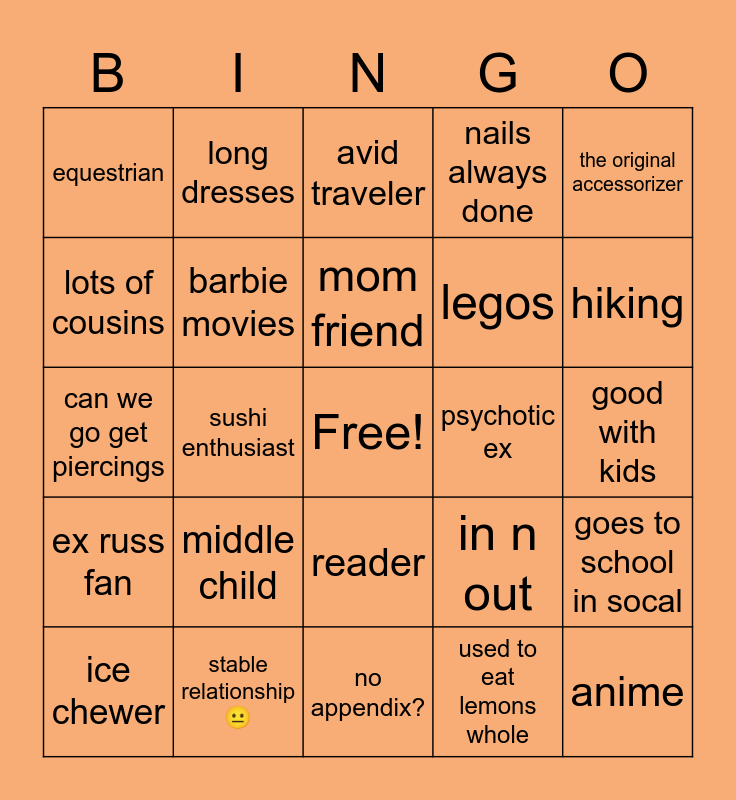 This bingo card has a free space and 24 words: middle child, stable relationship😐, mom friend, ice chewer, the original accessorizer, equestrian, lots of cousins, long dresses, psychotic ex, reader, legos, can we go get piercings, in n out, goes to school in socal, barbie movies, used to eat lemons whole, good with kids, avid traveler, hiking, sushi enthusiast, anime, ex russ fan, nails always done and no appendix?.