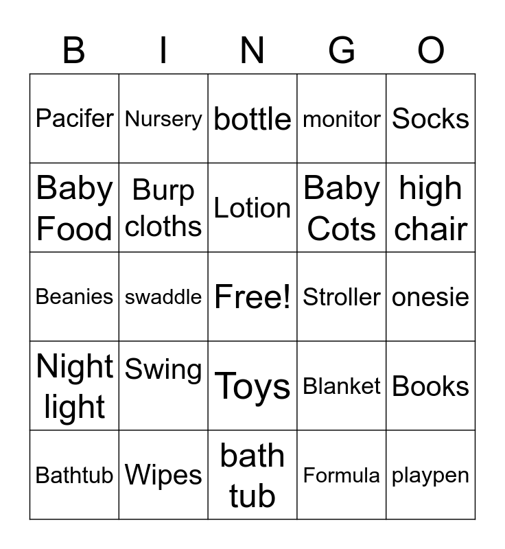This bingo card has a free space and 24 words: Swing, Wipes, Lotion, Bathtub, Socks, Pacifer, Baby Food, Nursery, Stroller, Toys, Baby Cots, Beanies, Blanket, Books, Burp cloths, Formula, onesie, bottle, high chair, swaddle, playpen, Night light, monitor and bath tub.