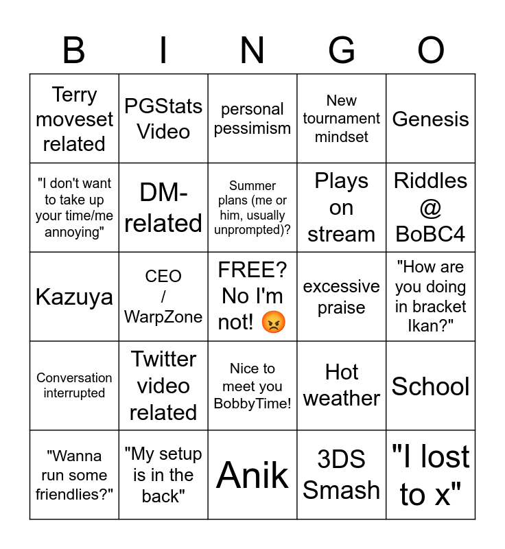 This bingo card has a free space and 24 words: Twitter video related, "My setup is in the back", Summer plans (me or him, usually unprompted)?, "Wanna run some friendlies?", Genesis, Terry moveset related, "I don't want to take up your time/me annoying", PGStats Video, excessive praise, Nice to meet you BobbyTime!, Plays on stream, Kazuya, Hot weather, School, DM-related, 3DS Smash, "How are you doing in bracket Ikan?", personal pessimism, Riddles @ BoBC4, CEO / WarpZone, "I lost to x", Conversation interrupted, New tournament mindset and Anik.