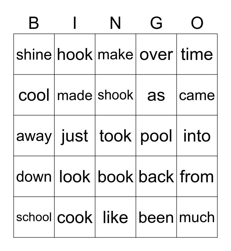 This bingo card has a free space and 24 words: look, cook, shook, school, time, shine, cool, hook, pool, book, as, away, back, from, made, been, into, make, came, just, much, down, over and like.