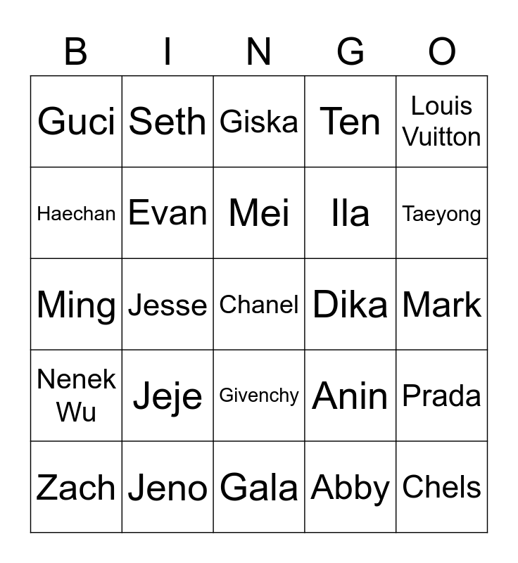 This bingo card has a free space and 24 words: Jeje, Jeno, Mei, Zach, Louis Vuitton, Guci, Haechan, Seth, Dika, Givenchy, Ila, Ming, Anin, Prada, Evan, Abby, Mark, Giska, Taeyong, Jesse, Chels, Nenek Wu, Ten and Gala.