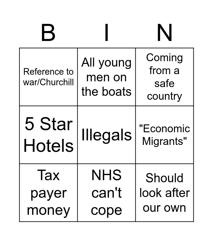 This bingo card has a free space and 8 words: "Economic Migrants", Coming from a safe country, All young men on the boats, Tax payer money, Reference to war/Churchill, Should look after our own, 5 Star Hotels and NHS can't cope.