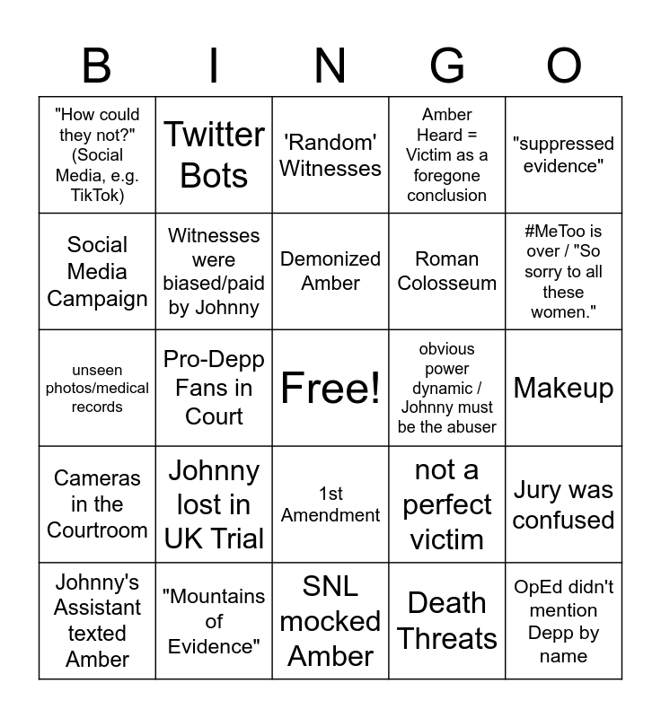 This bingo card has a free space and 24 words: Johnny lost in UK Trial, "Mountains of Evidence", Demonized Amber, Johnny's Assistant texted Amber, "suppressed evidence", "How could they not?" (Social Media, e.g. TikTok), Social Media Campaign, Twitter Bots, obvious power dynamic / Johnny must be the abuser, 1st Amendment, Roman Colosseum, unseen photos/medical records, not a perfect victim, Jury was confused, Witnesses were biased/paid by Johnny, Death Threats, Makeup, 'Random' Witnesses, #MeToo is over / "So sorry to all these women.", Pro-Depp Fans in Court, OpEd didn't mention Depp by name, Cameras in the Courtroom, Amber Heard = Victim as a foregone conclusion and SNL mocked Amber.