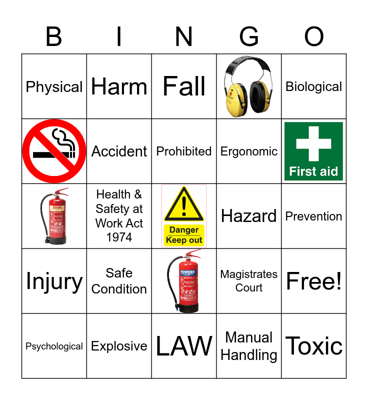 This bingo card has 13 images and 38 words: Fire Extinguisher, PPE, LAW, Safe Condition, Harm, Mandatory, Warning, Accident, Free!, Magistrates Court, Crown Court, Prohibited, Hazard, Risk, Biological, Health & Safety at Work Act 1974, Manual Handling, Physical, Ergonomic, Chemical, Toxic, Psychological, Fall, Inhalation, Absorption, Ingestion, Signs, Incorrect Manual Handling, Explosive, Irritant, Corrosive, Inflammable, Human Waste, Prevention, Injury, Medical, Dangerous and Environmental.