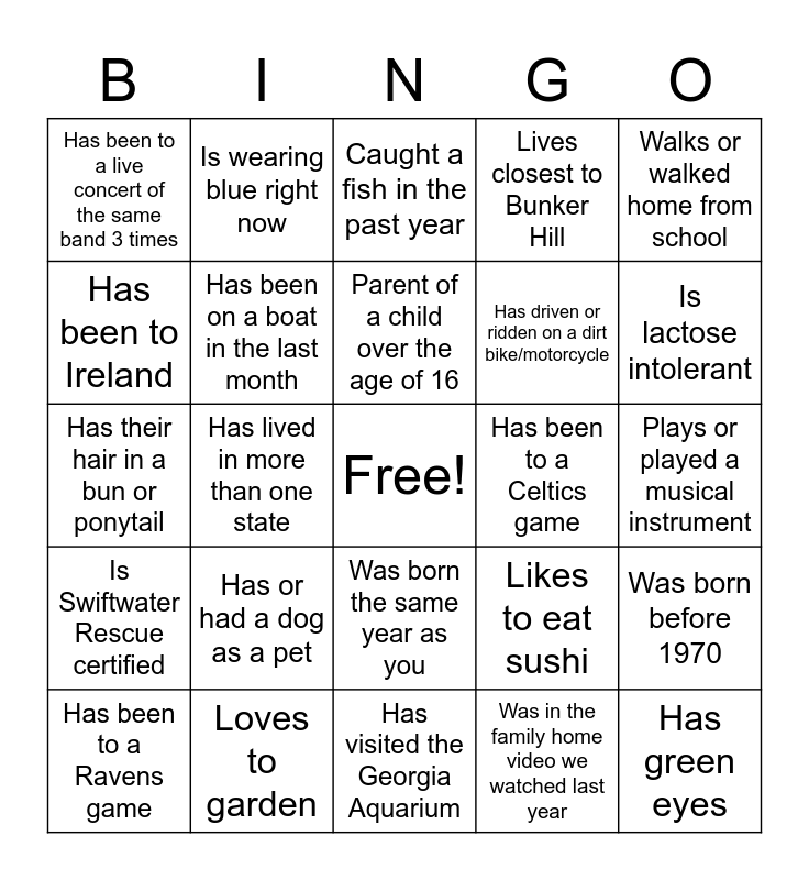 This bingo card has a free space and 84 words: Attended our reunion in 2000, Attended our reunion in 2021, Caught a fish in the past year, Currently uses a flip phone, Eats avocados, Got their hair cut in the past week, Has 2 middle names, Has a Facebook account, Has a food allergy, Has a June birthday, Has a twin, Has been in a parade, Has been on a boat in the last month, Has been to a Celtics game, Has been to a Lions game, Has been to a live concert of the same band 3 times, Has been to a Ravens game, Has been to Ireland, Has blue eyes, Has brown eyes, Has celebrated a birthday at the OBX reunion, Has driven or ridden on a dirt bike/motorcycle, Has green eyes, Has had stitches, Has lived in more than one state, Has lived or is living in New York City, Has met a celebrity, Has more than one tattoo, Has naturally curly hair, Has or had a cat as a pet, Has or had a dog as a pet, Has or had braces on their teeth, Has seen the new Top Gun: Maverick, Has their hair in a bun or ponytail, Has their learner's permit to drive, Has two of the same letters in their first or last name, Has visited the Georgia Aquarium, Is barefoot right now, Is lactose intolerant, Is Swiftwater Rescue certified, Is the middle child in their family, Is the oldest child in their family, Is the youngest child in their family, Is wearing a band-aid, Is wearing a hat, Is wearing an Apple watch, Is wearing blue right now, Is wearing something that says OBX, Knows how to play chess, Last name rhymes with stroll, Left before 8am to get here today, Likes to eat sushi, Lives closest to Bunker Hill, Lives closest to Washington, D.C., Lost a tooth this year, Loves roller coasters, Loves to garden, Parent of a child over the age of 16, Parent of a child under the age of 12, Plays or played a musical instrument, Plays or played lacrosse, Plays or played sports in high school, Reads a newspaper regularly (the paper kind), Serves or has served in the military, Sings or sang a solo or in a chorus on stage, Started a new job/got promoted since our last reunion, Uses an android phone, Wakes up before 6:30am on a typical work or school day, Walks or walked home from school, Was born after December 31, 2000, Was born before 1970, Was born in Vietnam, Was born outside the United States, Was born the same month as you, Was born the same year as you, Was in the family home video we watched last year, Watches Stranger Things, Will be a sophomore in high school this fall, Will be in middle school this fall, Will show you a yoga pose right now (do it with them), Will sing the chorus of a Taylor Swift song now, Works or worked in a school, Works or worked in health care and Writes with their left hand.