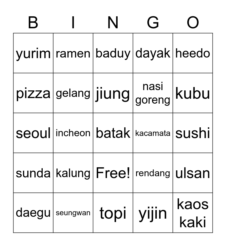 This bingo card has 26 words: Free!, yijin, jiung, seungwan, heedo, yurim, pizza, ramen, sushi, rendang, nasi goreng, seoul, ulsan, daegu, incheon, busan, dayak, sunda, baduy, batak, kubu, topi, kacamata, kalung, gelang and kaos kaki.