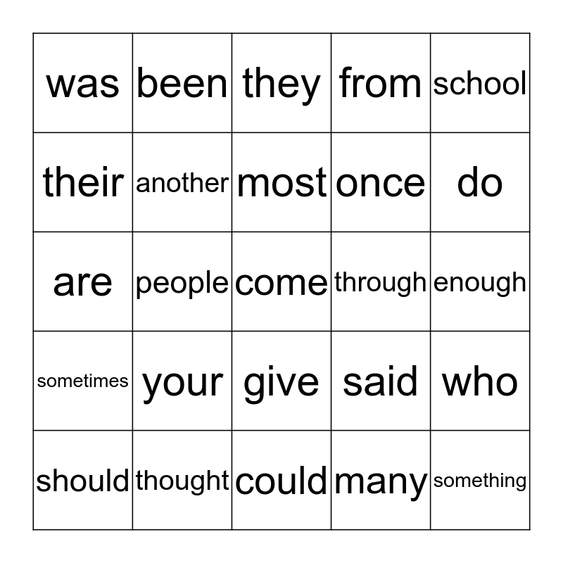 This bingo card has 25 words: your, could, most, should, school, was, their, been, through, give, once, are, said, who, another, something, enough, they, do, people, come, thought, sometimes, from and many.