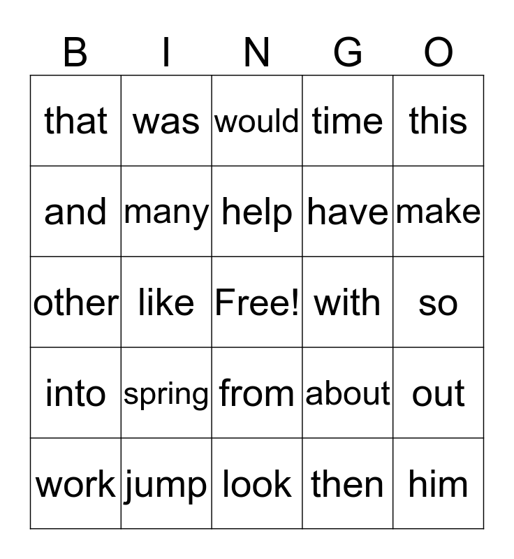 This bingo card has a free space and 24 words: spring, jump, help, work, this, that, and, was, with, from, have, other, about, out, many, then, so, would, make, like, him, into, time and look.