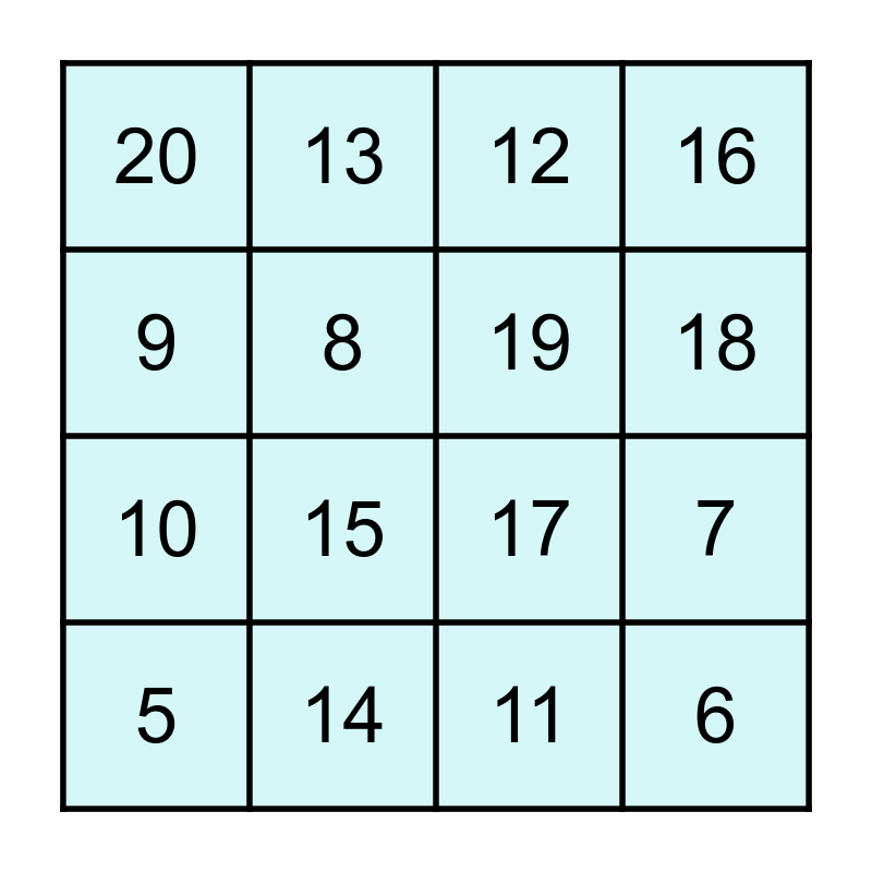 This bingo card has 16 words: 5, 14, 12, 16, 9, 13, 17, 7, 20, 8, 11, 18, 10, 15, 19 and 6.