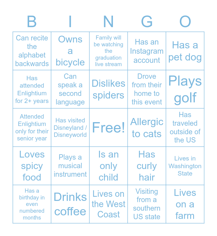 This bingo card has a free space and 64 words: Plays a sport while attending Enlightium, Is wearing a watch, Has broken a bone, Lives in Washington State, Has their own business, Favorite subject is math, Owns a bicycle, Likes Batman, Dislikes spiders, Wearing glasses, Is an only child, Has a pet other than a dog, Has traveled outside of the US, Has a pet dog, Has traveled to 5+ US states, Has attended Enlightium for 2+ years, Has visited Disneyland / Disneyworld, Can recite the alphabet backwards, Likes to go camping, Drove from their home to this event, Plays a musical instrument, Loves spicy food, Has an Instagram account, Met someone famous, Has an older sibling at this event, Traveled from the East Coast of the US, Going to college next year, Going to Silverwood on Saturday, First name starts with “D”, Has a birthday this month, Does volunteer work, Last name starts with “R”, Ate breakfast this morning, Wearing blue, Plays golf, Has a birthday in even numbered months, Flew to this event, Visiting from a southern US state, Has visited Hawaii, Can speak a second language, Attended Enlightium only for their senior year, Allergic to cats, Has a younger sibling at this event, Wearing red, Has blonde hair, Lives on a farm, Drinks coffee, Dislikes tomatoes, Has curly hair, Took AP classes at Enlightium, Has a birthday in an odd numbered month, Likes pepperoni pizza, Lives on the West Coast, Is left handed, Likes to ride horses, Has their driver's license, Family will be watching the graduation live stream, Likes to create art in their free time, Has a Netflix account, Favorite color is green, Taking a gap year, Likes chocolate ice cream, Visiting Washington for the first time and Likes to sing.