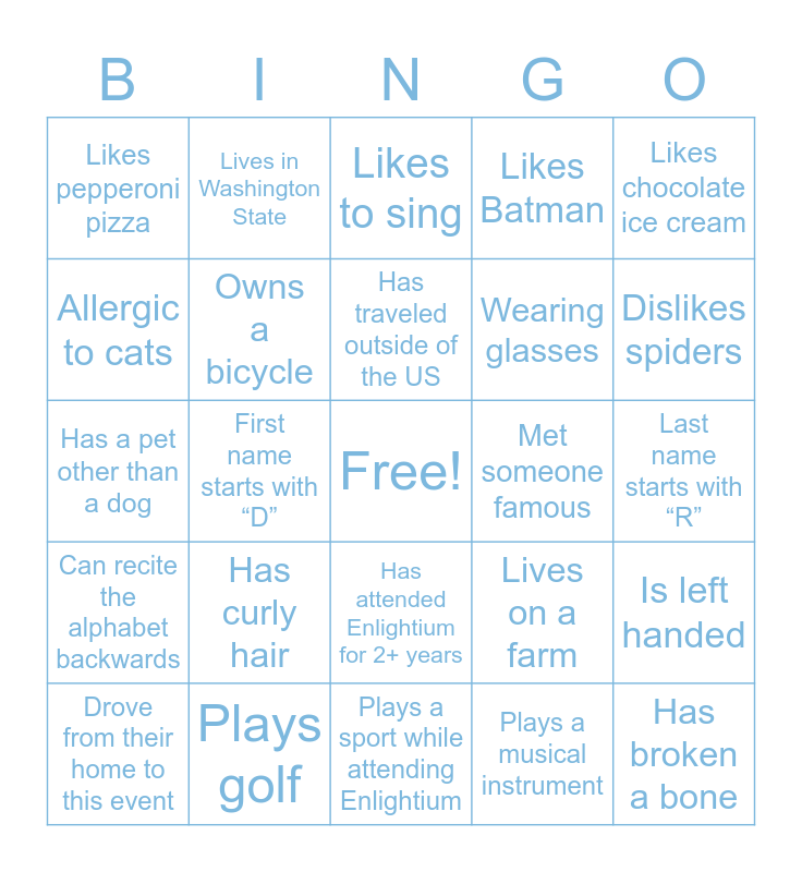 This bingo card has a free space and 64 words: Likes to ride horses, Took AP classes at Enlightium, Dislikes tomatoes, Is left handed, Going to college next year, Favorite subject is math, Lives in Washington State, Is wearing a watch, Has traveled outside of the US, Has a younger sibling at this event, Has attended Enlightium for 2+ years, Lives on the West Coast, Last name starts with “R”, Likes chocolate ice cream, Has their own business, Allergic to cats, First name starts with “D”, Likes pepperoni pizza, Has a Netflix account, Wearing glasses, Has curly hair, Can recite the alphabet backwards, Likes Batman, Has their driver's license, Has visited Hawaii, Attended Enlightium only for their senior year, Flew to this event, Has visited Disneyland / Disneyworld, Has traveled to 5+ US states, Has an Instagram account, Is an only child, Visiting from a southern US state, Going to Silverwood on Saturday, Has a pet dog, Dislikes spiders, Drove from their home to this event, Drinks coffee, Plays a musical instrument, Loves spicy food, Owns a bicycle, Has a pet other than a dog, Met someone famous, Wearing blue, Can speak a second language, Has a birthday in an odd numbered month, Has broken a bone, Plays golf, Taking a gap year, Lives on a farm, Visiting Washington for the first time, Likes to create art in their free time, Family will be watching the graduation live stream, Plays a sport while attending Enlightium, Wearing red, Has a birthday this month, Favorite color is green, Likes to sing, Ate breakfast this morning, Does volunteer work, Likes to go camping, Has blonde hair, Has a birthday in even numbered months, Has an older sibling at this event and Traveled from the East Coast of the US.