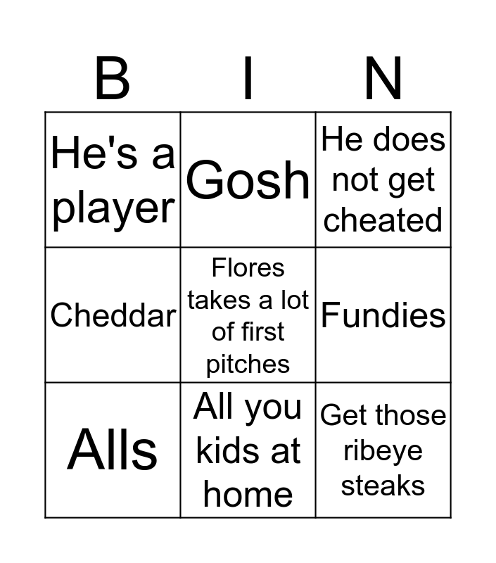 This bingo card has 9 words: Alls, He does not get cheated, Gosh, Cheddar, He's a player, Fundies, Flores takes a lot of first pitches, Get those ribeye steaks and All you kids at home.