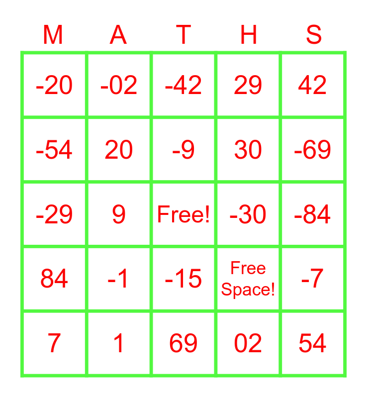 This bingo card has a free space and 25 words: -1, 69, -9, 7, 42, -20, -54, -02, -30, -15, 30, -29, Free Space!, -7, 20, 15, -84, -42, -69, 9, 54, 1, 84, 29 and 02.