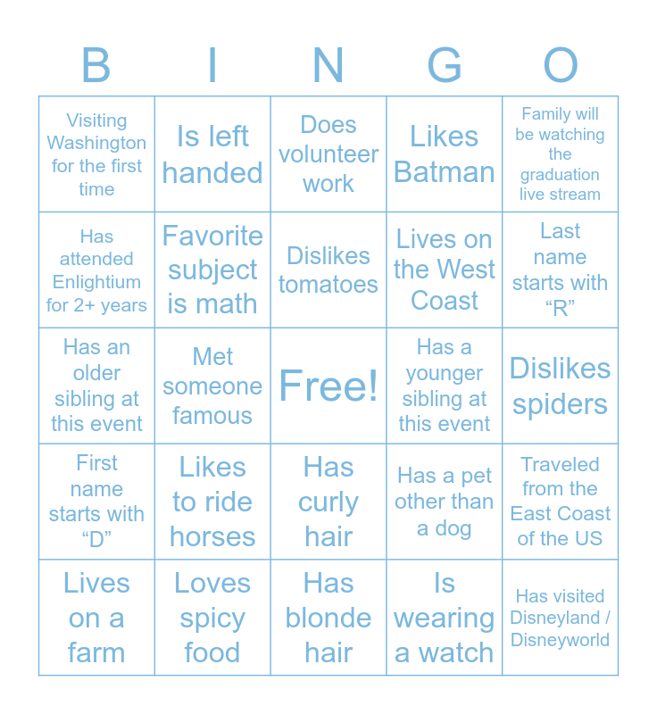 This bingo card has a free space and 64 words: Likes to go camping, Has a birthday in even numbered months, Going to Silverwood on Saturday, Traveled from the East Coast of the US, Wearing glasses, Ate breakfast this morning, Is left handed, Has traveled outside of the US, Dislikes tomatoes, Has a birthday in an odd numbered month, Has curly hair, Is an only child, Dislikes spiders, Family will be watching the graduation live stream, Drove from their home to this event, Has attended Enlightium for 2+ years, Met someone famous, Visiting Washington for the first time, Likes to sing, Lives on the West Coast, Likes to ride horses, First name starts with “D”, Likes Batman, Flew to this event, Owns a bicycle, Taking a gap year, Wearing red, Has their own business, Wearing blue, Going to college next year, Has an Instagram account, Plays a musical instrument, Has their driver's license, Has traveled to 5+ US states, Last name starts with “R”, Lives on a farm, Visiting from a southern US state, Is wearing a watch, Likes pepperoni pizza, Favorite subject is math, Has an older sibling at this event, Has a younger sibling at this event, Plays golf, Took AP classes at Enlightium, Favorite color is green, Has visited Disneyland / Disneyworld, Loves spicy food, Has visited Hawaii, Has a pet other than a dog, Can recite the alphabet backwards, Has broken a bone, Plays a sport while attending Enlightium, Has blonde hair, Has a birthday this month, Allergic to cats, Has a Netflix account, Does volunteer work, Has a pet dog, Drinks coffee, Attended Enlightium only for their senior year, Can speak a second language, Likes chocolate ice cream, Likes to create art in their free time and Lives in Washington State.