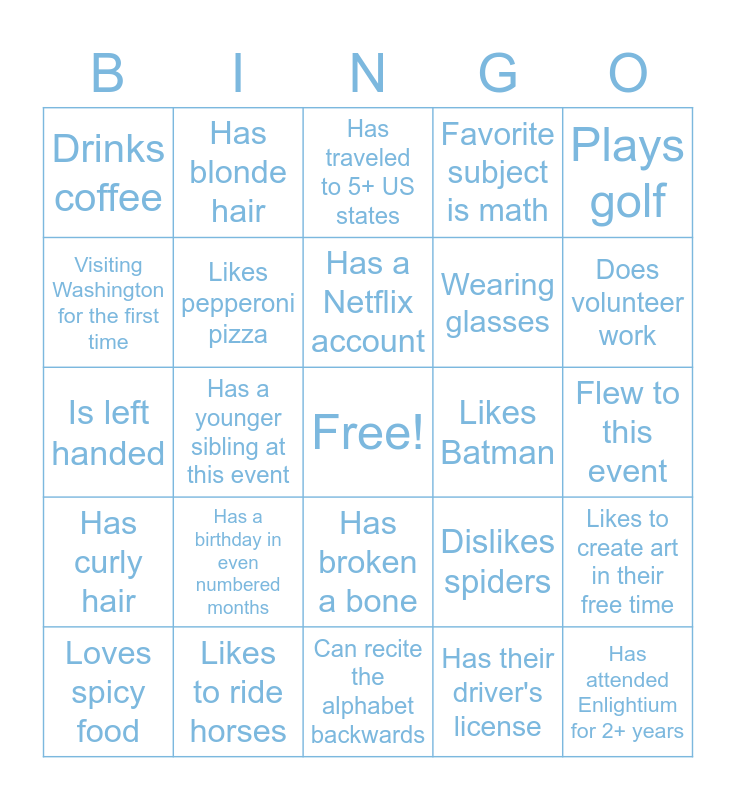 This bingo card has a free space and 64 words: Drove from their home to this event, Last name starts with “R”, Has a pet other than a dog, Likes to create art in their free time, Favorite color is green, Has traveled outside of the US, Has blonde hair, Has an Instagram account, Has a Netflix account, Allergic to cats, Has broken a bone, Going to Silverwood on Saturday, Flew to this event, Plays golf, First name starts with “D”, Visiting Washington for the first time, Has a younger sibling at this event, Drinks coffee, Likes to sing, Wearing glasses, Has a birthday in even numbered months, Has curly hair, Favorite subject is math, Plays a sport while attending Enlightium, Is an only child, Attended Enlightium only for their senior year, Has an older sibling at this event, Can speak a second language, Owns a bicycle, Plays a musical instrument, Took AP classes at Enlightium, Lives on a farm, Has a birthday in an odd numbered month, Has a pet dog, Does volunteer work, Loves spicy food, Going to college next year, Has their driver's license, Dislikes tomatoes, Likes pepperoni pizza, Is left handed, Likes Batman, Family will be watching the graduation live stream, Lives on the West Coast, Has a birthday this month, Has attended Enlightium for 2+ years, Likes to ride horses, Met someone famous, Dislikes spiders, Lives in Washington State, Has visited Hawaii, Visiting from a southern US state, Can recite the alphabet backwards, Likes chocolate ice cream, Likes to go camping, Ate breakfast this morning, Has traveled to 5+ US states, Is wearing a watch, Wearing red, Has their own business, Has visited Disneyland / Disneyworld, Traveled from the East Coast of the US, Wearing blue and Taking a gap year.