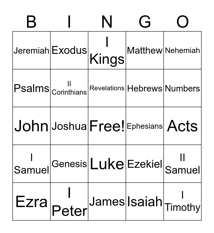 This bingo card has a free space and 24 words: Genesis, I Peter, Revelations, Ezra, Nehemiah, Jeremiah, Psalms, Exodus, Ephesians, Luke, Hebrews, John, Ezekiel, II Samuel, II Corinthians, Isaiah, Acts, I Kings, Numbers, Joshua, I Timothy, I Samuel, Matthew and James.