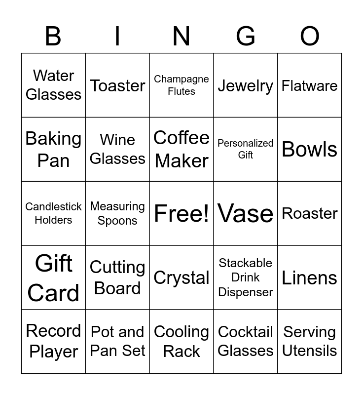 This bingo card has a free space and 29 words: Record Player, Air Fryer, Measuring Spoons, Plates, Water Glasses, Champagne Flutes, Wine Glasses, Cutting Board, Vase, Pot and Pan Set, Roaster, Serving Utensils, Cooling Rack, Cocktail Glasses, Bowls, Juicer, Crystal, Gift Card, Flatware, Candlestick Holders, Stackable Drink Dispenser, Towels, Personalized Gift, Baking Pan, Jewelry, Toaster, Linens, Coffee Maker and Candles.